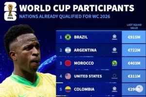 体育资讯10月14日讯 德转列出已经锁定2026年世界杯参赛资格的球队的身价排行榜,巴西、阿根廷前二,佛得角第20位。