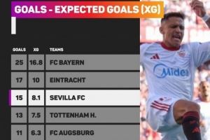 3.塞维利亚:15球,预期进球数8.1,正负值+6.9