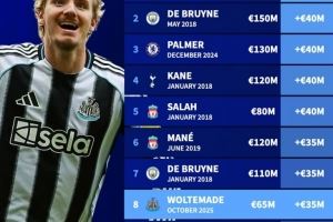 7、德布劳内,2018年1月,1.1亿欧 ,+3500万欧