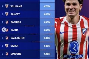 体育资讯10月3日讯 西甲球员身价更新,德转列出西甲非皇马和巴萨球员的身价前十,阿尔瓦雷斯1亿欧第一。